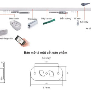 - Động cơ rèm; bộ phụ kiện và điều khiển từ xa: Là bộ phận chính giúp kéo/mở rèm, thường gắn trên thanh treo.